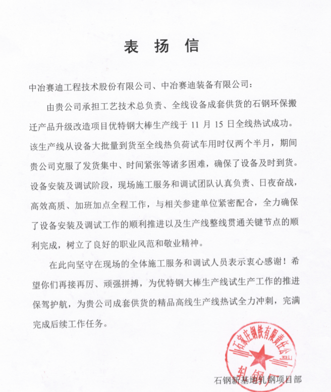 由貴公司承擔工藝技術總負責、全線設備成套供貨的石鋼環保搬遷產品升級改造項目優特鋼大棒生產線于11月15日全線熱試成功。該生產線從設備大批量到貨至全線熱負荷試車用時僅兩個半月,期間貴公司克服了發貨集中、時間緊張等諸多困難,確保了設備及時到貨。設備安裝及調試階段,現場施工服務和調試團隊認真負責、日用奮戰,高效高質、加班加點全程工作,與相關參建單位緊密配合,全力確保了設備安裝及調試工作的順利推進以及生產線整線貫通關鍵節點的順利完成,樹立了良好的職業風范和敬業精神。