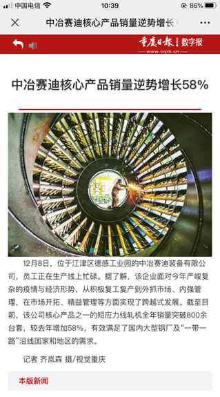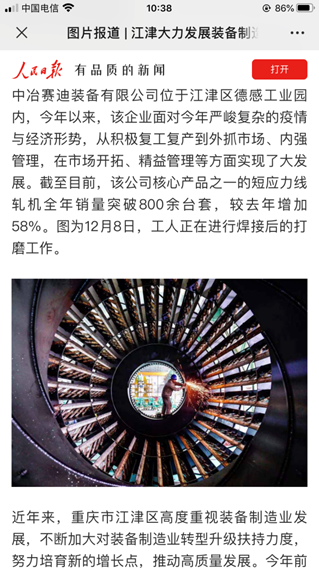面對(duì)公司良好的發(fā)展勢(shì)頭,各路媒體紛至沓來(lái),爭(zhēng)相報(bào)道。重慶衛(wèi)視新聞聯(lián)播以《中冶賽迪:技術(shù)創(chuàng)新推動(dòng)數(shù)字化轉(zhuǎn)型》為題,著重報(bào)道了賽迪裝備“產(chǎn)品化”和科技創(chuàng)新成果;人民日?qǐng)?bào)以《江津大力發(fā)展裝備制造業(yè),助推高質(zhì)量發(fā)展》為題,重點(diǎn)介紹了賽迪裝備在精益管理、市場(chǎng)開(kāi)拓上的重大突破;重慶日?qǐng)?bào)也推出《中冶賽迪核心產(chǎn)品逆勢(shì)增長(zhǎng)58%》的報(bào)道,展現(xiàn)賽迪裝備在今年復(fù)雜形勢(shì)下實(shí)現(xiàn)的跨越式發(fā)展。,
