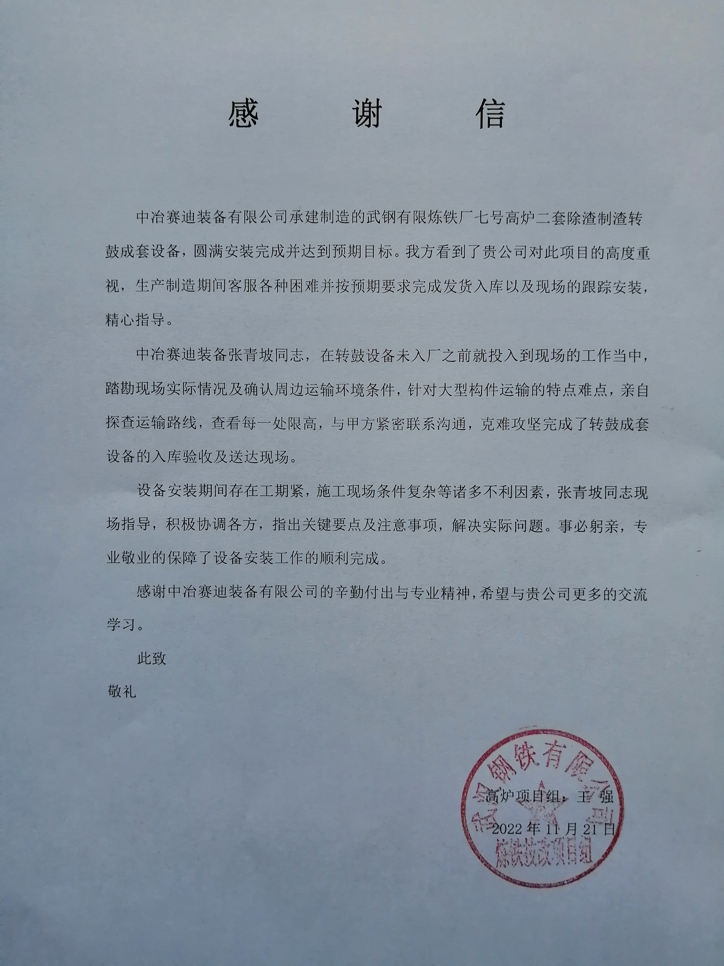 11月21日,武鋼業主來信,對裝備公司承制的武鋼有限煉鐵廠七號高爐二套除渣制渣轉鼓成套設備圓滿完成安裝并達到預期目標提出表揚。